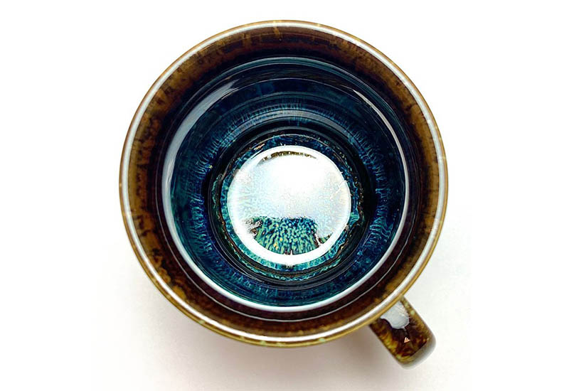 利用釉水內的氧化鐵和鍛燒過的氧化鈷與礦物元素燒制的天目。利用各種礦物本身的化學元素不同,會產生相斥相融的特點,配合物理反應的燒制曲線加速礦物的流速形成兔毫反應,猶如希臘神話,海神波賽頓的雙眼,浩如煙波,洞若秋眸!