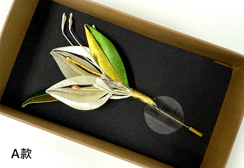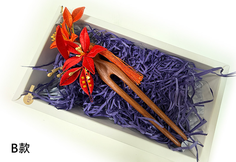 尺寸:髮釵: 20.5*8*5 cm,領針: 13.5*7*2.5 cm 材質:6X15X3cm 繡線、金屬、實木釵