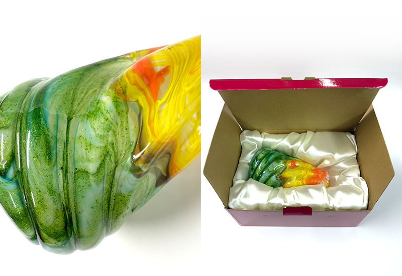於1300度玻璃漿結合不同係數玻璃材質配色透過吹製及手工拉製塑型出各種不同風格的藝術品。