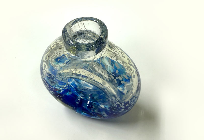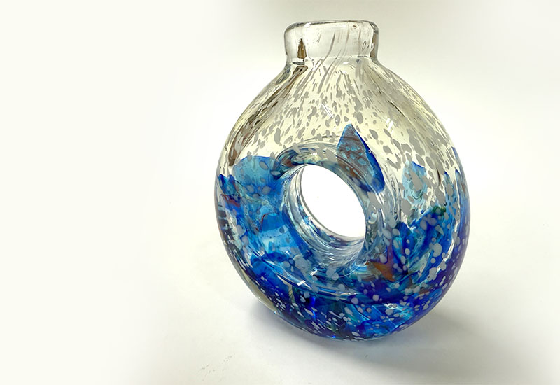 此件成品,以其流動的藍色紋理和圓環造型,讓人聯想到浩瀚的星海和無盡的宇宙。藍色與透明玻璃的交融加入夜光粉使其宛如宇宙中的星雲,展現出無限的深邃與神秘。光線穿透玻璃時的折射效果,猶如星辰閃爍,讓人感受到宇宙的壯麗與奇妙。