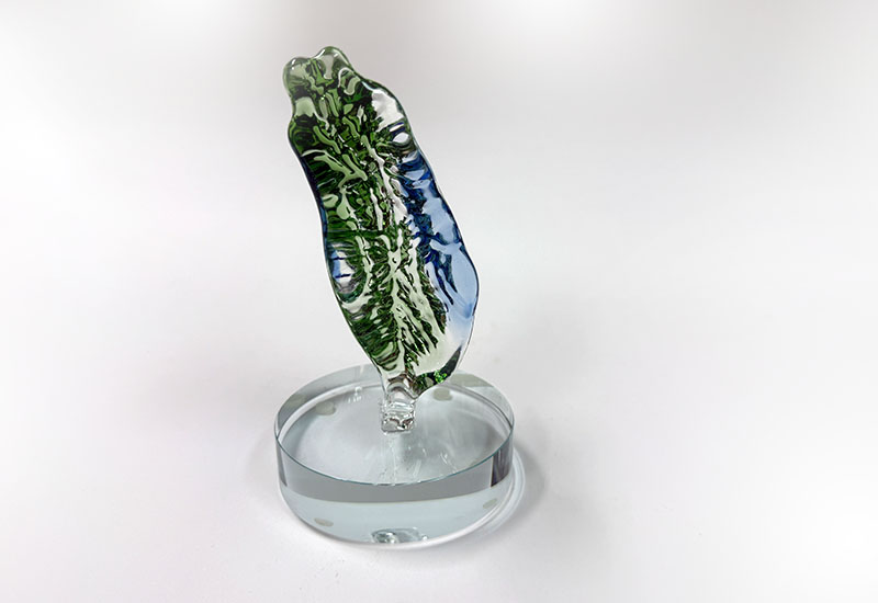 以玻璃壓模技法成形,透過漸層展現台灣海岸的浪影與光線。羽形象徵守護與希望,在透明玻璃中呈現出細緻紋理與自然流動感。