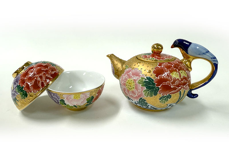 茶壺化作翩翩藍鵲,翅羽間映著盛開牡丹,生氣盎然;對杯以牡丹、金幣點綴彩雲,寓意富貴榮華、財運如雲般滾滾而來