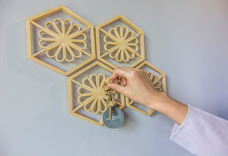 另一件作品「幸福愉塊」也頗有巧思,以台灣特產日月潭總統魚當筷架,搭配阿里山檜木筷子,做成筷子禮盒,諧音取「愉筷」。木筷上鑲有水鑽,兼具美觀也有「賺得快」趣味性。銀色的總統魚也有「盈餘」的意思;兩條銀色總統魚則變成「雙贏」。