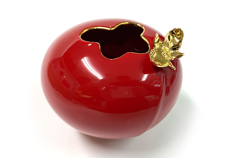 以花苞為器型,通體上紅色釉燒成,取其紅包的吉祥意義。再飾以盛開的蘭花,祝福來年從含苞走向盛開綻放!