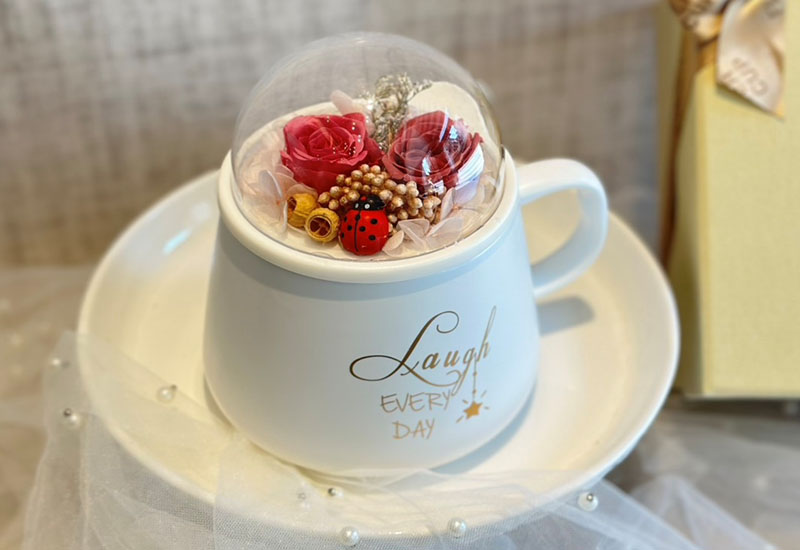 材質:陶器杯子、永生玫瑰、永生繡球花