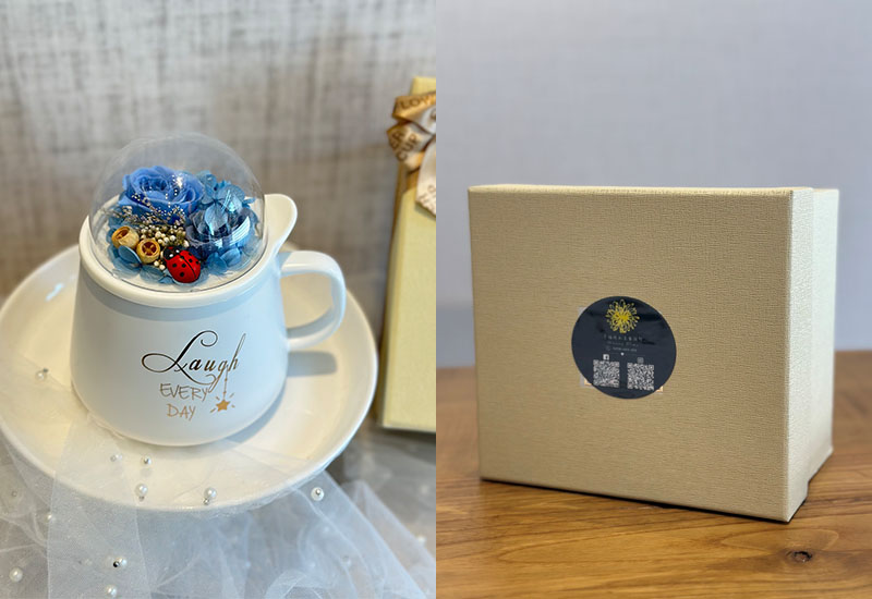 以天空藍永生玫瑰為主調、搭配淡藍繡球花、帶來安定氛圍、送給需要放鬆及鼓勵的人、讓馬克杯增添色彩及趣味。