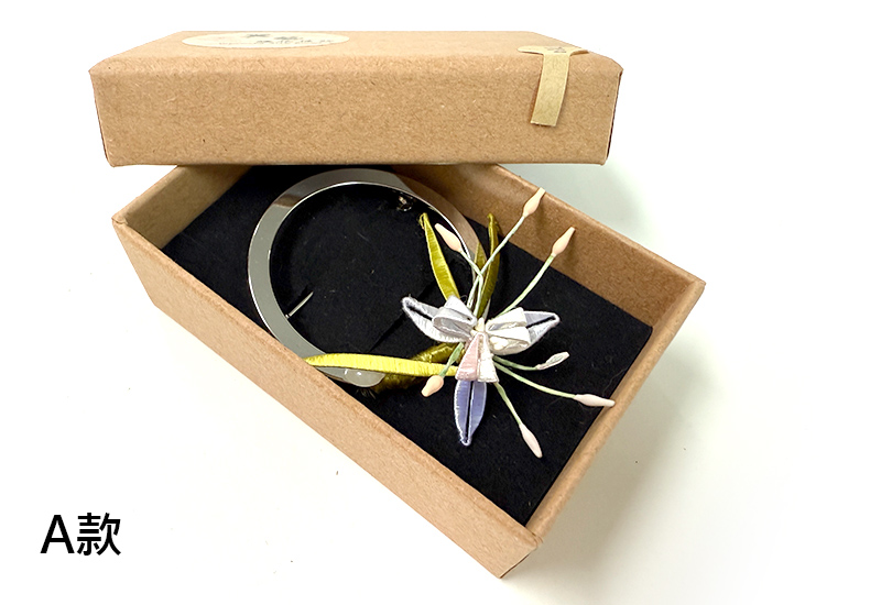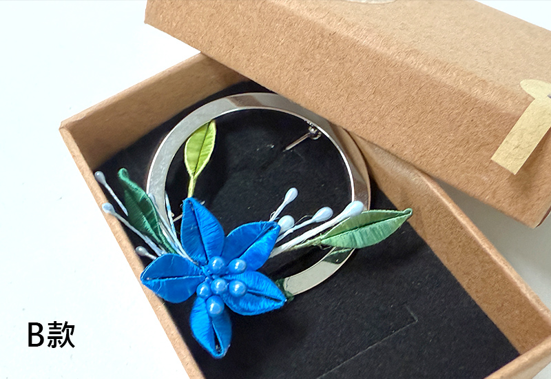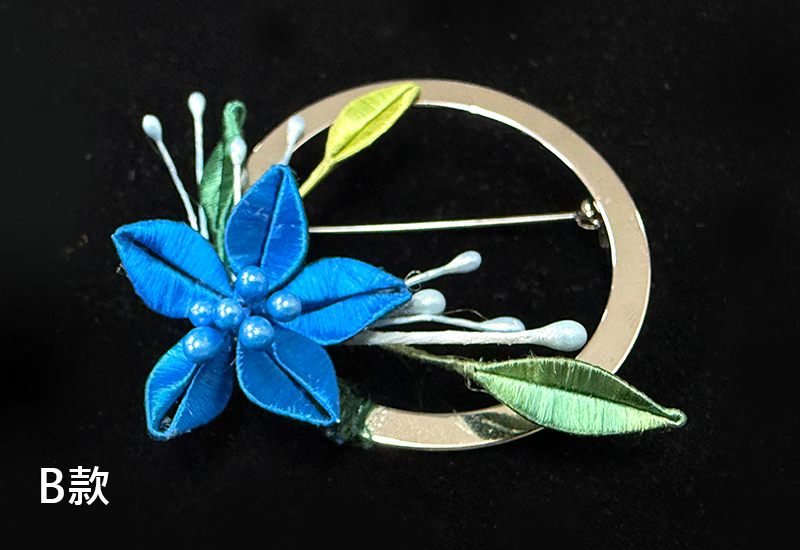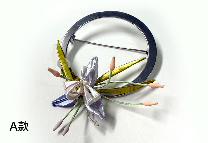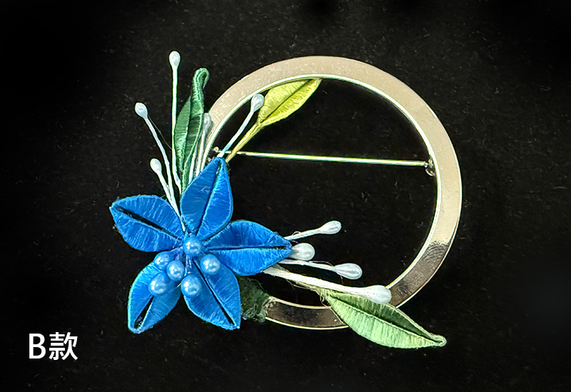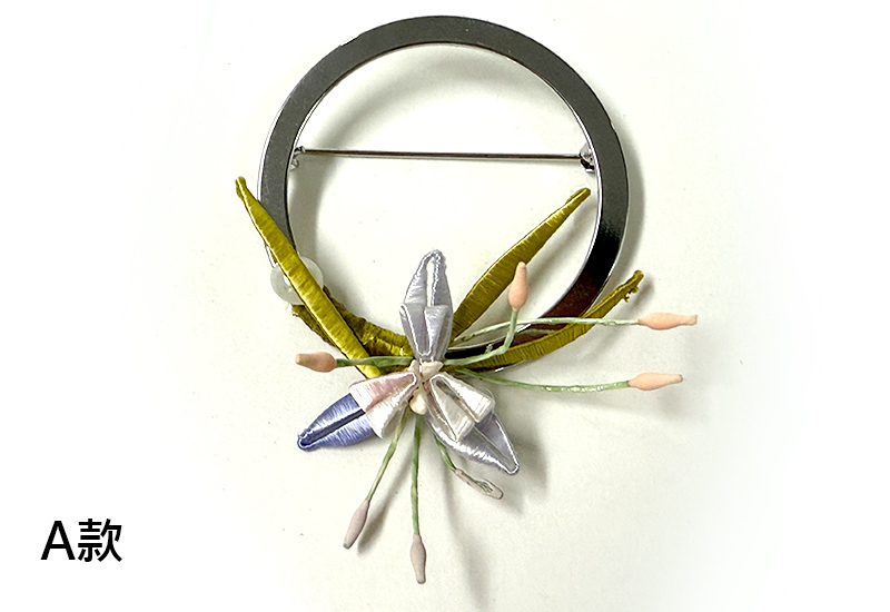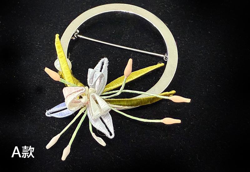 圓潤的金屬環象徵著滿月,承載人們對團圓與圓滿的期盼。纏花工藝以絲線層層纏繞,幻化成盛放的花卉,紅與紫交映,如同花團錦簇的佳節時光。花語傳遞吉慶與喜悅,月色寄寓團圓與美滿,將「花好月圓」的祝福凝結於胸前一隅。此件作品不僅是飾品,更是一份祈願,願佩戴者的生命如花綻放,如月圓滿。