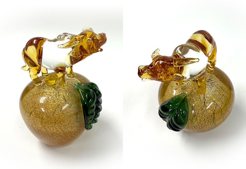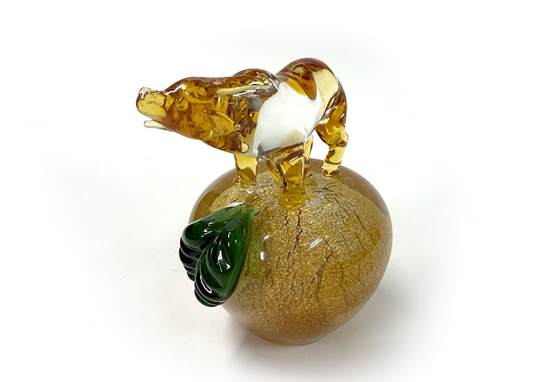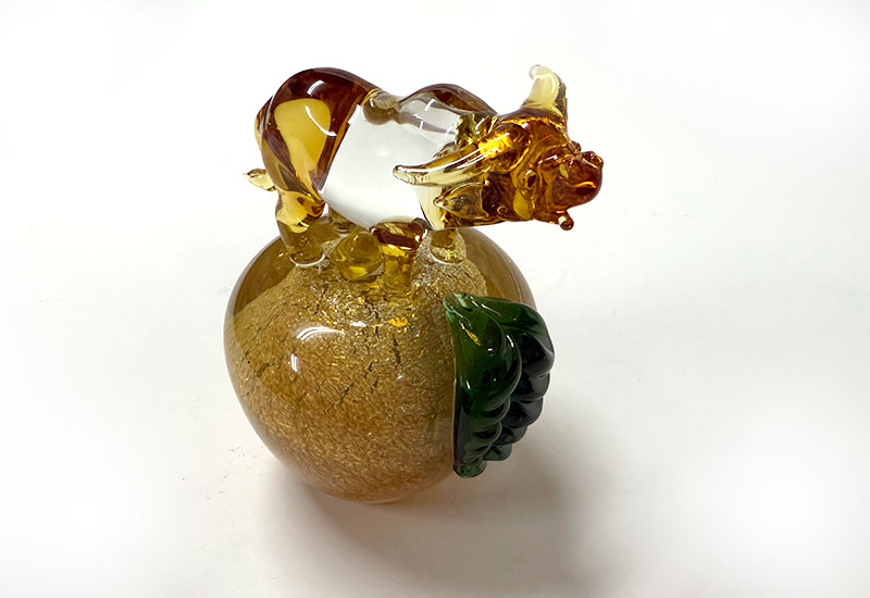 以傳統坩堝窯爐手工熱塑打造的十二生肖系列,每件皆立於銀箔烤金蘋果之上,象徵平安、富貴與好運相隨。玻璃質地透亮、金箔光澤華麗,是兼具寓意與美感的收藏精品。