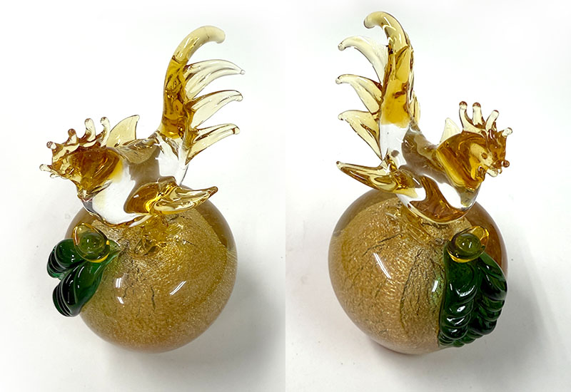 以傳統坩堝窯爐手工熱塑打造的十二生肖系列,每件皆立於銀箔烤金蘋果之上,象徵平安、富貴與好運相隨。玻璃質地透亮、金箔光澤華麗,是兼具寓意與美感的收藏精品。
