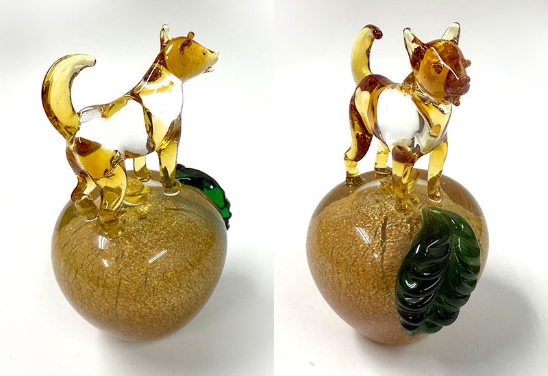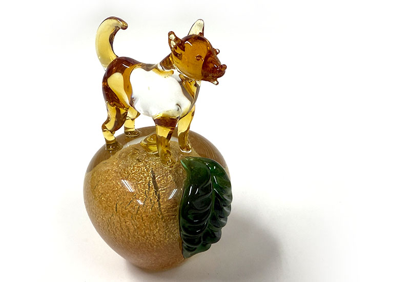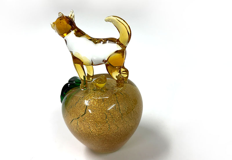 以傳統坩堝窯爐手工熱塑打造的十二生肖系列,每件皆立於銀箔烤金蘋果之上,象徵平安、富貴與好運相隨。玻璃質地透亮、金箔光澤華麗,是兼具寓意與美感的收藏精品。