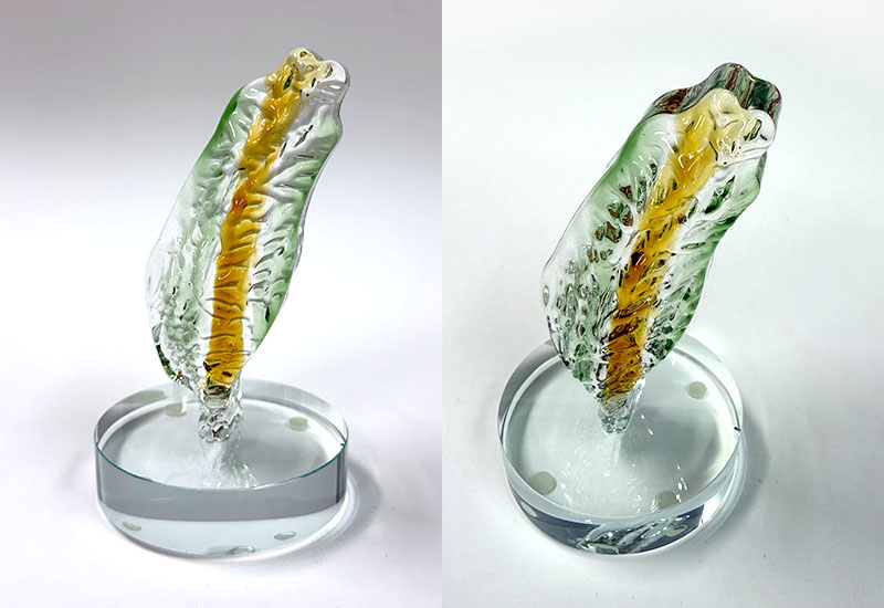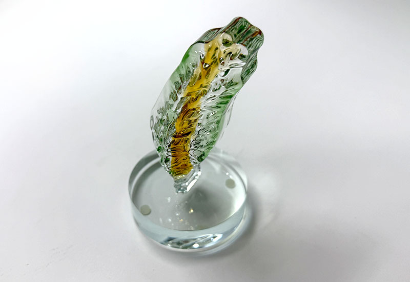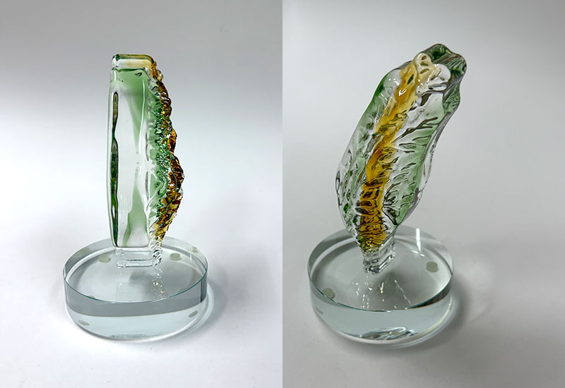 於1300度玻璃漿結合不同係數玻璃材質配色透過吹製及手工拉製塑型出各種不同風格的藝術品。