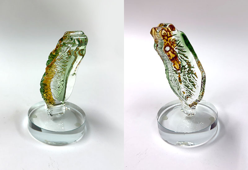 以玻璃壓模技法成形,透過漸層展現台灣海岸的浪影與光線。羽形象徵守護與希望,在透明玻璃中呈現出細緻紋理與自然流動感。