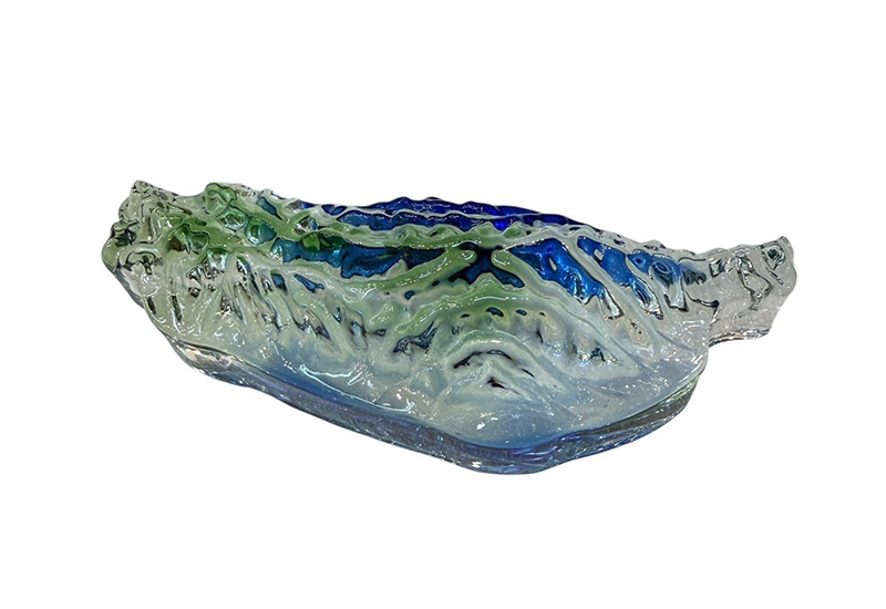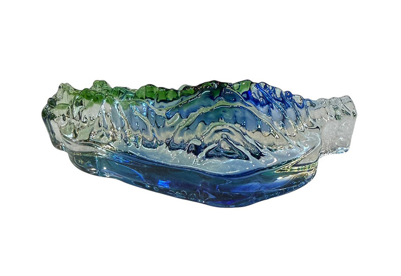 以玻璃壓模技法成形,透過漸層展現台灣海岸的浪影與光線。羽形象徵守護與希望,在透明玻璃中呈現出細緻紋理與自然流動感。